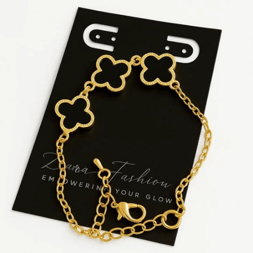 Elevate your elegance with this stunning Black and Gold Clover Bracelet, a perfect fusion of luxury and minimalism. Featuring three iconic four-leaf clover charms, each crafted with glossy black enamel and bordered by intricate beaded gold detailing, this bracelet symbolizes luck and timeless charm.